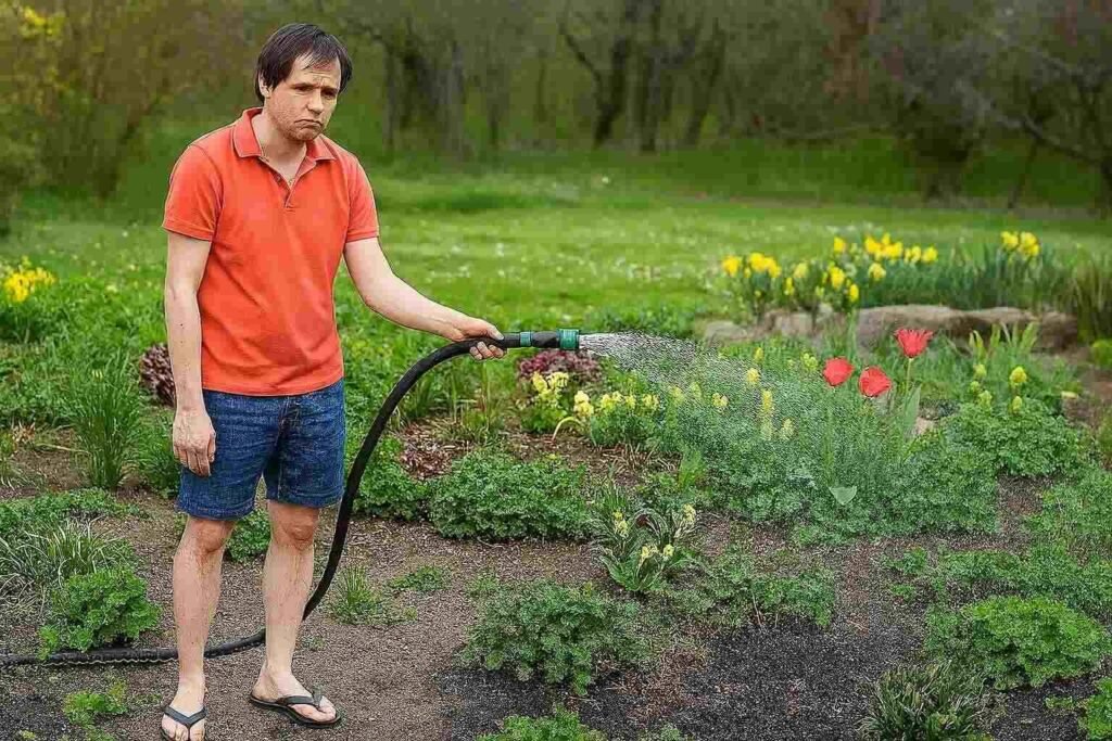 Bangun pagi, pegang selang, keliling halaman, baju basah, dan buang buang waktu.