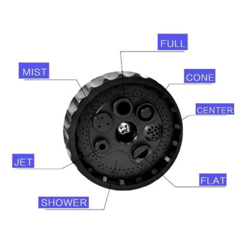 Nozzle Sprayer memiliki 7 fungsi semprotan berbeda yaitu : Jet, Shower, Flat, Cone, Soaker, Mist dan Center