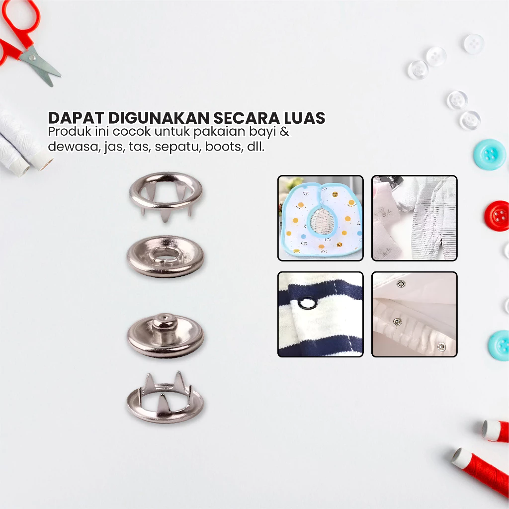 β 1 Set Lengkap Tang + Kancing Siap Pakai β Pasang Sendiri Tanpa ke tukang Jahit β Bahan Stainless Steel ANTI KARAT β Portabel & mudah disimpan β Termasuk Kancing Sebanyak 100 Buah