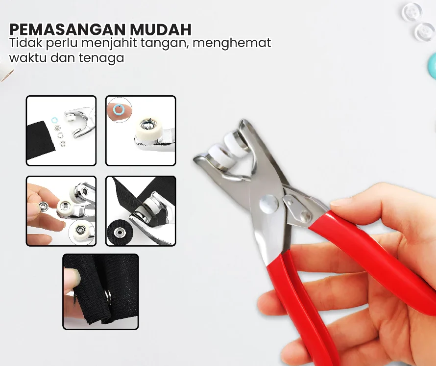 ✅ 1 Set Lengkap Tang + Kancing Siap Pakai ✅ Pasang Sendiri Tanpa ke tukang Jahit ✅ Bahan Stainless Steel ANTI KARAT ✅ Portabel & mudah disimpan ✅ Termasuk Kancing Sebanyak 100 Buah